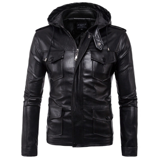 Men's Black Military Inspired Detachable Hoodie Lambskin Leather Jacket