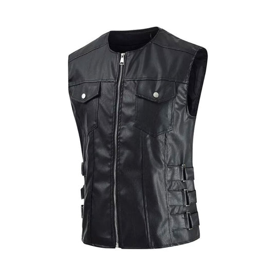 Men’s Black Sleeveless Genuine Lambskin Leather Moto Biker Waistcoat