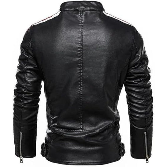 Men’s Red and Black Varsity Stand Collar Cafe Racer Leather Jacket